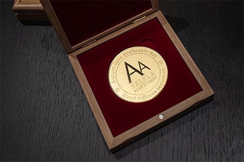 The Rock Award is a gold-plated metal plaque, which is presented to the Award winners in a walnut wood gift box along with a certificate. The plaque bears the logo of the 'The Rock' Foundation and a Latin inscription: 'Gold is tested in fire' and 'We have seen it and thus certify'.